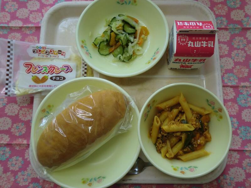 【献立】 減量コッペパン・ペンネポロネーゼ・みかんサラダ・チョコクレープ・牛乳