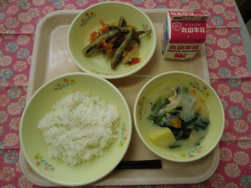 【献立】 むぎごはん・めひかりの南蛮漬け・豆乳みそ汁・牛乳