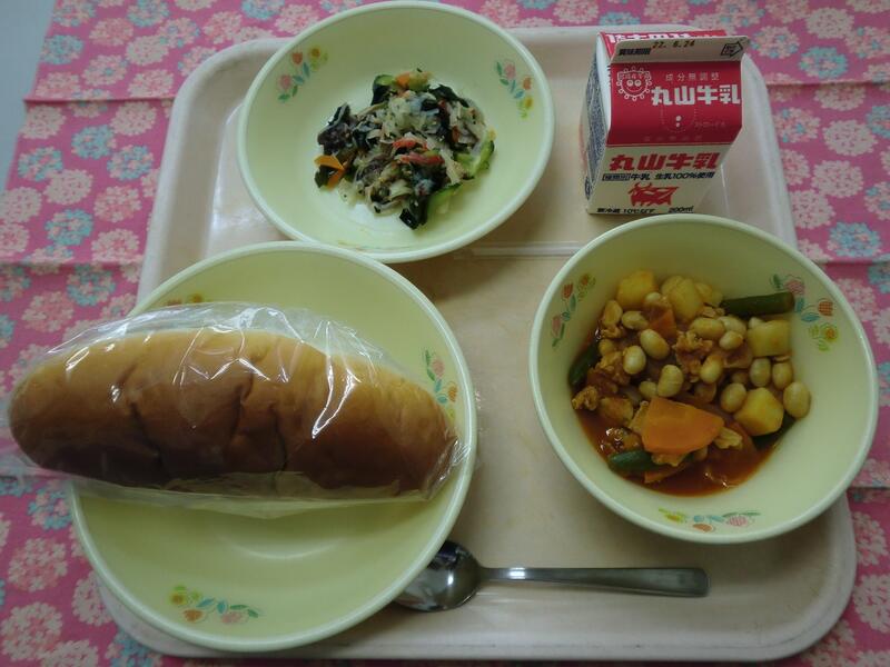 【献立】 ミルクパン・ポークビーンズ・海藻サラダ・牛乳