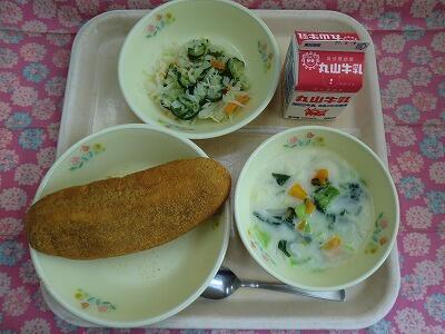 【献立】 チーズパン・豚肉のごまみそマヨネーズ・マロニースープ・牛乳