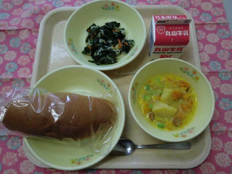 【献立】 黒糖パン・スイートポテトシチュー・ひじきのサラダ・牛乳