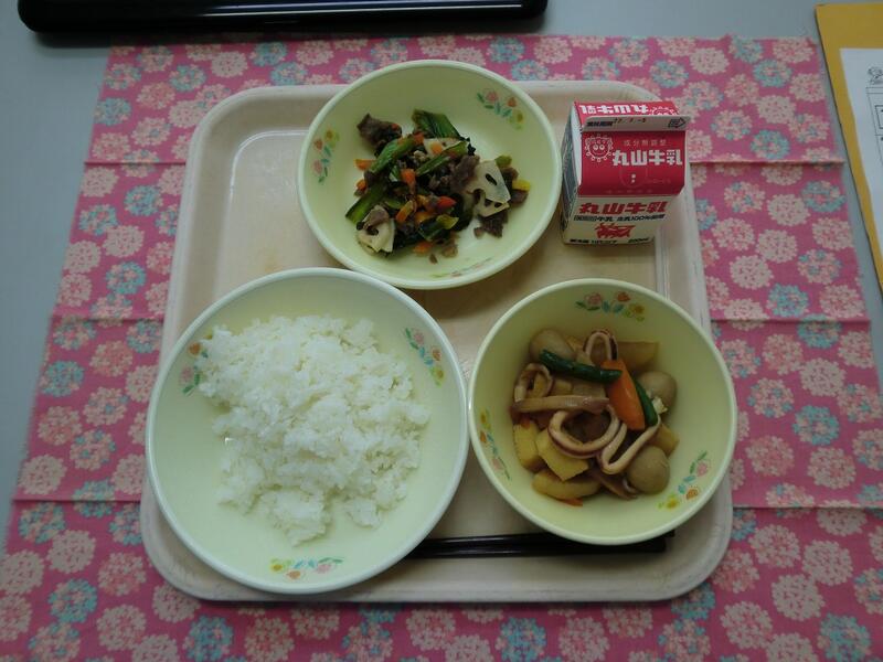 【献立】 むぎごはん・いかと大根の煮つけ・牛肉のヘベ酢和え・牛乳