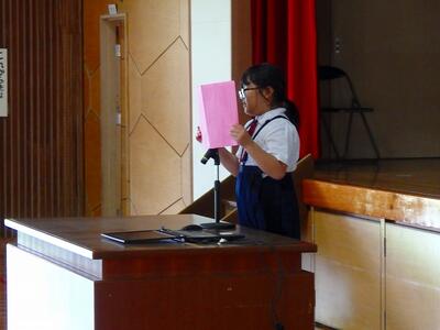5年生の代表児童は、勉強では漢字の練習をがんばって、習った漢字を全部書けるようになること。家庭では、家族の一員として、自分にできる家庭の仕事に進んで取り組み、母親の負担を減らしたいと発表しました。