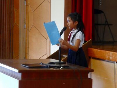 児童代表発表では、1・3・5年生の代表児童が2学期の目標やがんばりたいことについて書いた作文を発表しました。