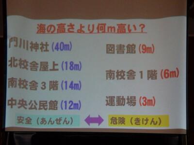 まずは、8月8日(木)に起こった地震の状況を伝え、津波が発生した場合には、命を守る行動として、どこへ逃げるべきか標高とともに示されました。