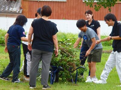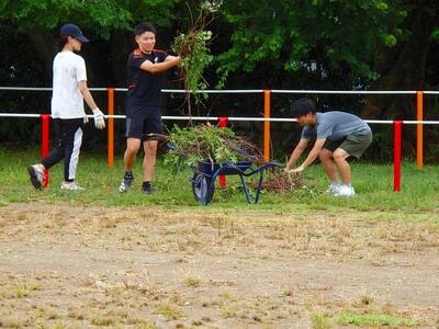 しかし、運動場や児童玄関前、駐車場、給食受入室前などには、落ち葉や折れた枝などが散乱していましたので、ほうきや手押し車を持ち出して、職員朝会終了後に全職員で片付け作業を行いました。これで児童も、9月2日(月)から安心して校門をくぐって児童玄関に向かったり、運動場で学習や遊んだりできます。また、給食運搬車も安全に給食を給食受入室に運ぶことができます。