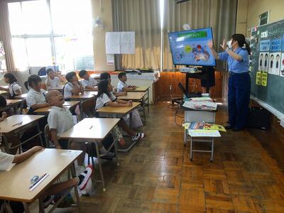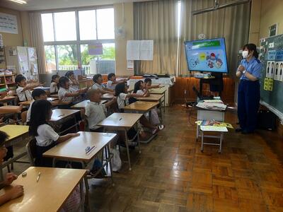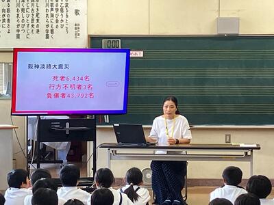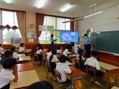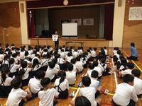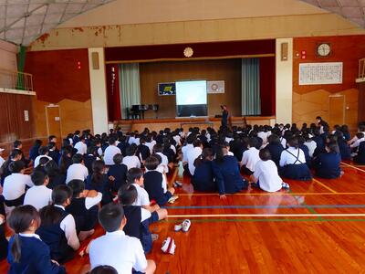 防災講話では、4~6年生が対象でした。門川町役場総務課消防防災係の担当者にお越しいただき、門川町の防災についてのお話をしていただきました。お話の中で、8月に起きた地震では、遮断機が下り、踏切が渡れなかった箇所があったことや、高齢者の避難が少なかったこと、信号無視をした車があったこと等の事例が取り上げられ、自分たちで積極的に声をかけたり考えたりすることが大切であると改めて感じました。さらに、ローリングストックや、普段から家具を固定しておくことなど、自宅でできる工夫についても考えることができました。今回のお話を伺って、児童は、ますます防災についての知識を高めることができました。