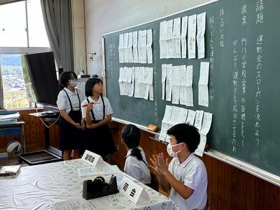 9月9日(月)の6時間目は、代表委員会が行われました。今回は、運営・集会委員会の5・6年生の議長、副議長、書記を中心に、「運動会のスローガンを決めよう」という議題で、①どんな運動会にしたいか②スローガンに入れたい言葉について話し合いました。