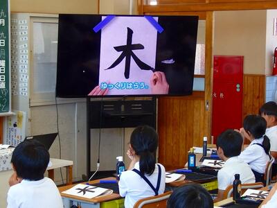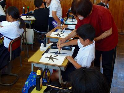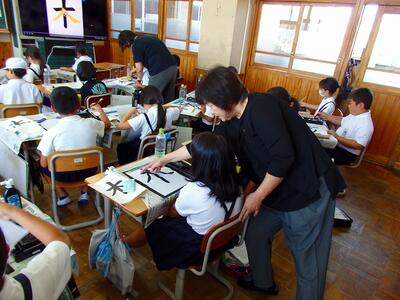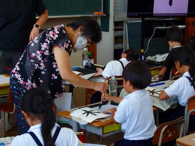 そこで、門川町書道連盟の先生方にご協力をいただきました。特に今回は、5名の先生方に、筆の持ち方や筆の運び等のちょっとしたコツを教えていただきました。先生方に教えていただくと、あら不思議。とってもかっこいい「木」になりました。さすが、書道のプロでした。教えていただいたことを熱心に児童が反復練習すると、最後には、みんな満足のいく「木」を書くことができました。