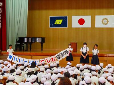 まず、運営・集会委員会の児童がスローガンを発表しました。今年のスローガンは「せいいっぱい楽しむ運動会」です。それに対して、それぞれの団の団長・副団長がどうすれば「せいいっぱい楽しめるのか」について話しました。「みんなで盛り上がる。」「練習をがんばる。」「常に全力で取り組む。」等の発言がありました。