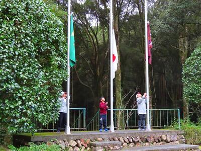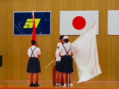 朝のつどいでは、係児童がしっかり活躍しました。旗を揚げたり、体操をしたりして、むかばきの自然の音やにおいを感じました。