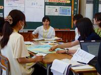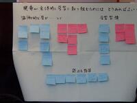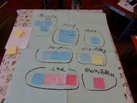 児童が下校すると、低学年、中学年、高学年の先生方でそれぞれ集まり、そこに北部教育事務所や門川町教育委員会の指導主事の先生方が加わりました。そして、今行われた5校時の研究授業をもとに、良かった点、課題となった点を洗い出し、これからどのような点に気を付けて授業力向上の研究を続けていけばよいか話し合いました。先生方全員の意見が尊重されるように、付箋に自分の考えをいくつも書き出し、それを模造紙に貼るときに似たものはまとめていく「KJ法」という手法を取り入れました。