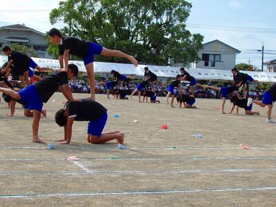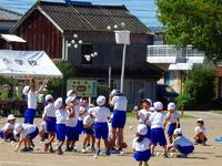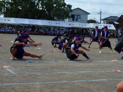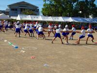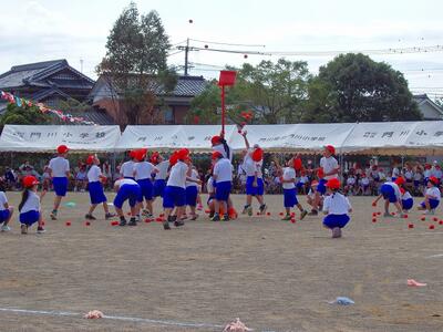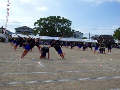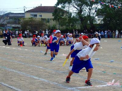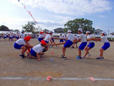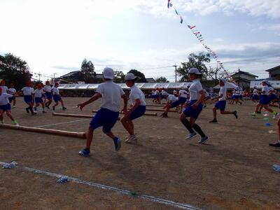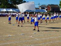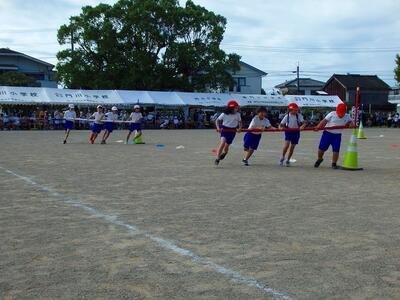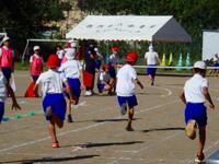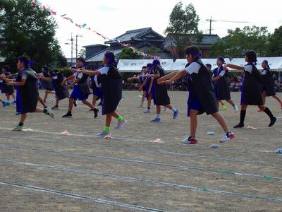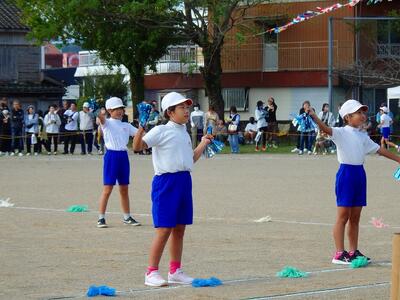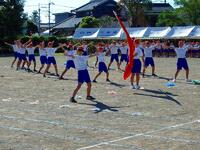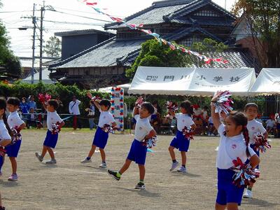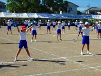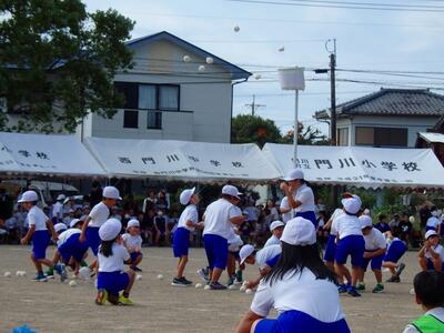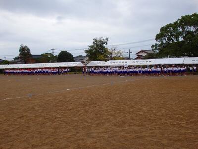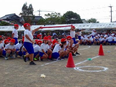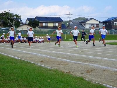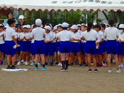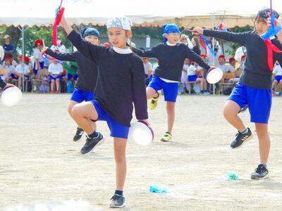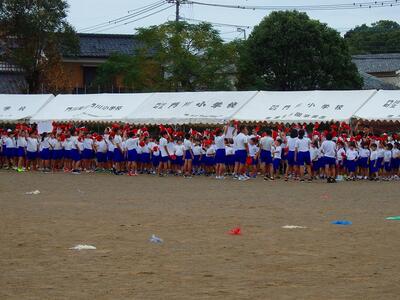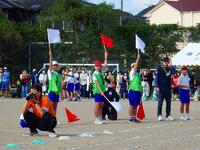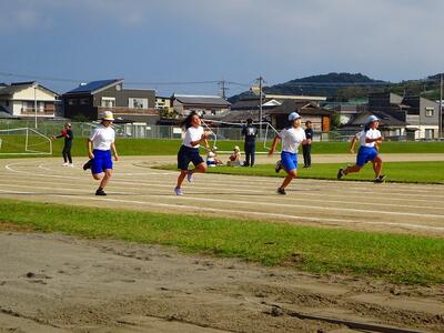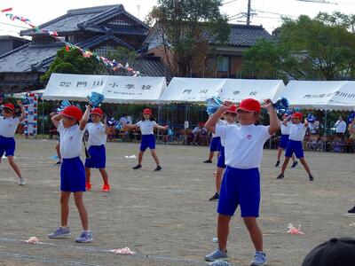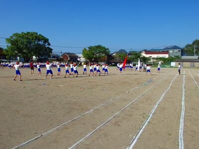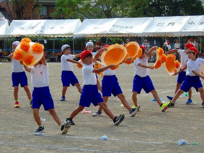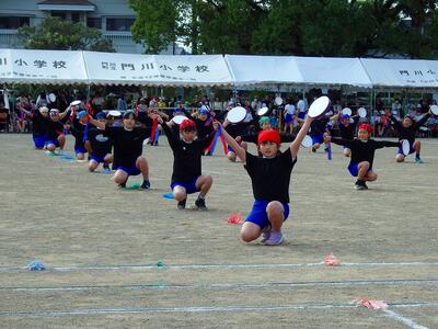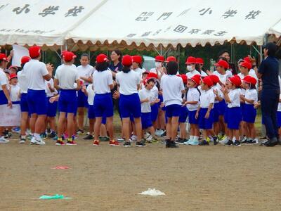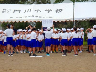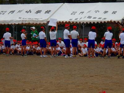 天候に恵まれ、時間帯によっては日差しの強さも感じられるほどでしたが、秋の日の一日、競技や応援などを行い、日頃経験できないことをして過ごすことができました。黄色はちまきが、門川小学校の児童でした。