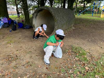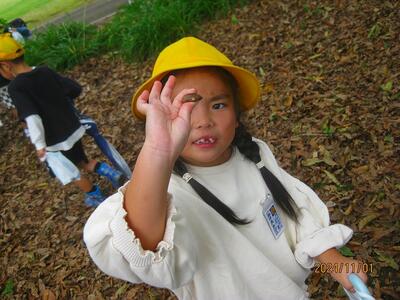 秋探しでは、少しずつ場所を移動しながらどんぐりや落ち葉を拾いましたが、「ここのは、丸くて大きい!」「ここは、小さくて尖っている!」と、樹木の種類によるどんぐりの違いに驚いたようです。また、落ち葉を「これは、お面に使えそうだな」と、今後の活動を見通して拾う児童もいました。