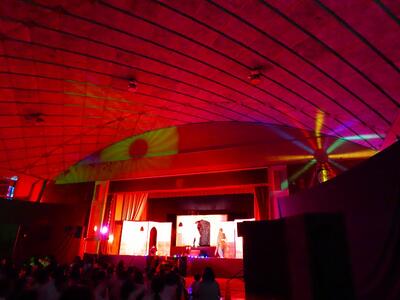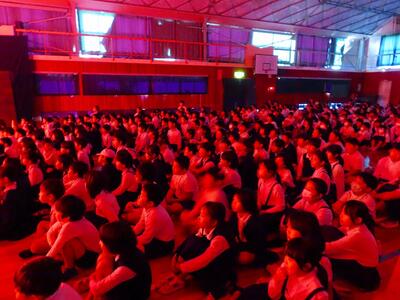 劇が始まると、体育館全体を使ったプロジェクションマッピングに大歓声があがりました。