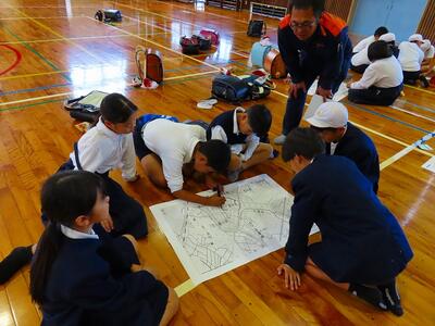防災図上訓練では、地区会長様、民生委員児童委員様、門川小学校PTA地域安全部員様にお越しいただき、教職員や児童の中に入られて、各地区の地図を見ながら話し合うことができました。地区ごとに、危険な場所や避難場所を確認した後に避難経路を選択したり、どのような行動をとりながら避難することが最適なのか意見を出し合ったりしました。