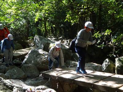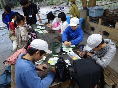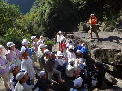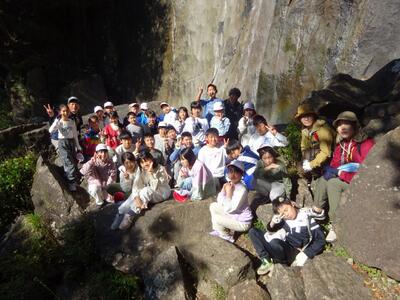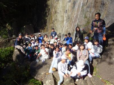 午前中の活動は、むかばき山の滝を目指しての「滝トレッキング」でした。大自然を楽しみながら、友達と会話を弾ませ、でも1時間くらいたってくると“まだですか?”“あと何分くらいですか?”と言う質問も飛び交いながら何とか滝に到着しました。見上げる滝の高さは77m、滝を間近に霧状のマイナスイオンを浴び、登山の達成感と相まって子ども達の様子はとてもすがすがしい感じでした。