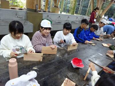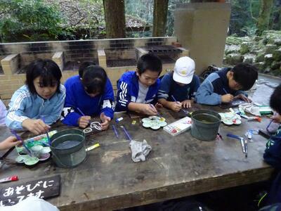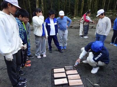 お弁当昼食の後は、午後からの活動「杉焼き板細工」でした。杉板に錐で穴を開けたり、ヤスリで角を丸くしたりしながら、形を整えていきました。バーナーで板を焼いてもらった後、それぞれ飾り付けをしていきました。玄関先の表札、部屋のドアにかける表示板、将来の目標やむかばき宿泊の記念板・・・等など、それぞれ思い思いに味のある作品を完成させていました。記念になるお土産ができましたね。