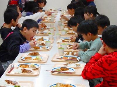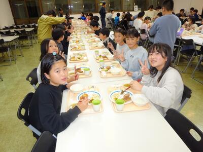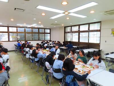むかばき最後の食堂での昼食です。ハヤシライスをおかわりする子が多かったです。2日間、朝早くから食事を用意してくださった食堂のみなさんに感謝しながら味わいました。また、これをきっかけに、家での食事や給食への感謝も改めて考えていきたいですね。