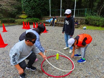午前中の「イニシアティブゲーム」では、班で協力して6つのゲームに取り組みました。リーダーが進んで声をかけて移動したり、作戦を考えたりして盛り上がりました。グループの「ふり返りシート」に「協力して〇〇ができました。」という言葉が多かったです。