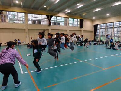「むかばきレコード」では、各クラスが2つのグループに分かれて、長縄をしました。とても難しかったのですが、跳べたときは歓声が上がり、拍手が自然と起こりました。