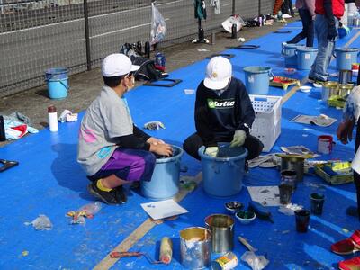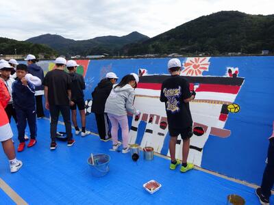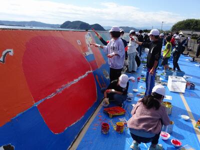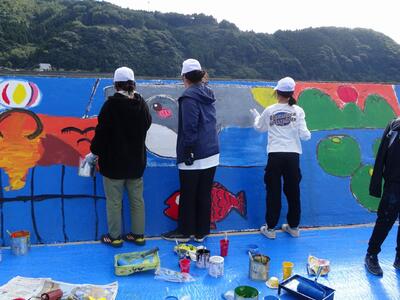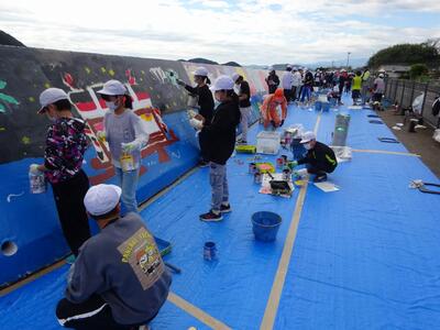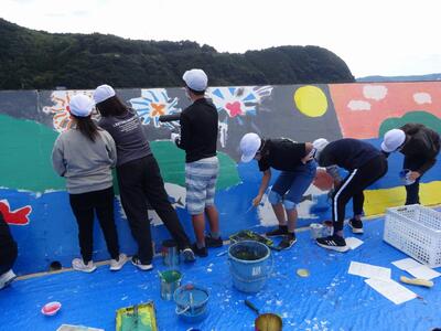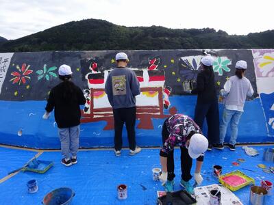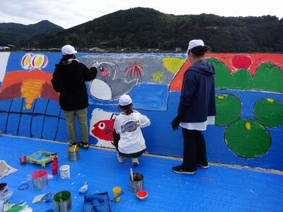門川町の小学校6年生は代々、庵川の堤防の壁にペンキで絵を描いています。
