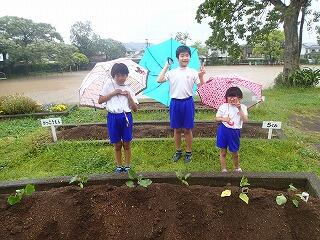 特別支援学級(5組)の子どもたちが今年も夏野菜を植えました。あいにくの天気でしたが、なす・きゅうり・トマトの苗を自分たちで植えることができました。この日のために、事前に雑草を抜いたり、土をスコップで掘り起こしたり、うねをつくったりしてきました。これからは夏野菜パーティーを成功させるために、毎日の水やりを頑張っていきます!