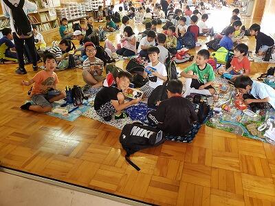 「やっと、着いた!」と思ったころに、雨が・・・。残念ながら、遊具で遊ぶことはできませんでしたが、心の杜の体育館で楽しく過ごすことができました。頑張って歩いたことはよい思い出になったと思います。3年生、よく頑張りました!!