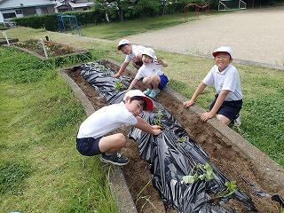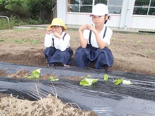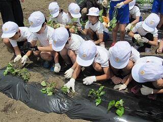 2年生と特別支援学級の子どもたちがさつま芋の苗植えをしました。地域の方が協力して畑を耕したり、マルチを張ったりしてくださいました。苗の植え方や今後のお世話の仕方も詳しく教えてくださいました。秋の収穫が大成功するように、お世話を頑張ってほしいと思います。