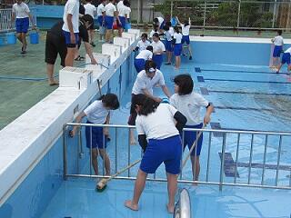 5月28日(火)、5年生と6年生によるプール清掃が行われました。3・4校時は5年生、5・6校時は6年生とそれぞれに別れて、プールを隅々まできれいに掃除してくれました。5年生は初めてでしたが、6年生は昨年も取り組んでいるので動きもテキパキとしていて、プールが見る見るうちにきれいになっていきました。これから少しずつ水を貯め、6月10日(月)にプール開きを行い、子どもたちが楽しみにしている水泳の学習が始まります。
