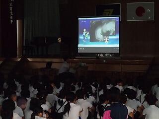今月は体育館に全校児童が集まって風水害に関するビデオを視聴して、大切なポイントを全員で確認しました。今回の学びを生活の中で生かして、自分の命を自分で守れるようになってほしいと思います。