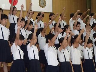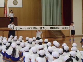 8月30日の朝の時間に結団式が行われました。団長の6年生がペットボトルの水を振って変わった色がそれぞれの団の色となりました。運動会のスローガン発表があったり、団長、副団長、リーダーの自己紹介があったりして、運動会に向けてのやる気が一段と高まった子どもたちでした。運動会は9月29日(日)に実施予定です。