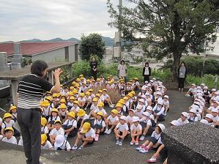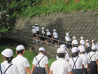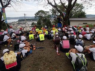9月26日(水)の朝の活動の時間に、5年生と6年生は「防災の日」の活動として、門川町中央公民館裏の高台の墓地まで、避難訓練を行いました。学校の屋上よりも高いところですが、歩道橋を渡って、坂道を歩かなければなりません。でも5・6年生はさすが最上級生。無言で速やかな行動ができていました。