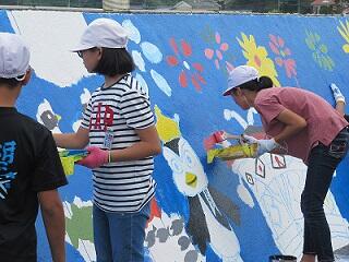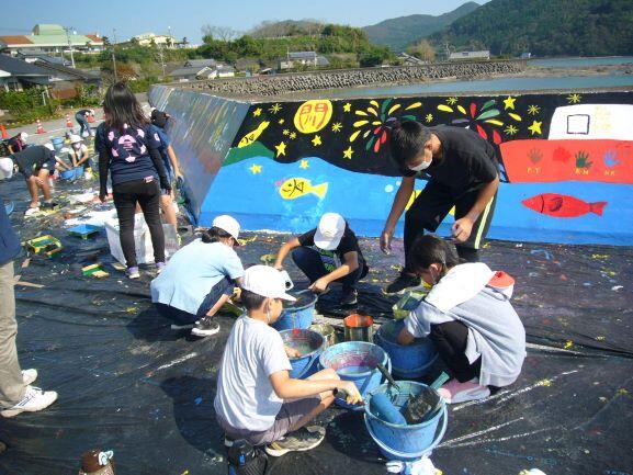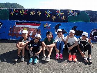 10月9日、毎年恒例の壁画制作が庵川漁港近くの堤防で行われました。門川小の6年生は、グループごとにふるさと門川をテーマにした壁画制作に取り組みました。ペンキで汚れたこともよい思い出になったことでしょう。みんな笑顔で協力しながら、時間内に壁画を完成させることができました。