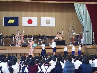 11月11日(月)に、村上三絃道のみなさんをお迎えして、鑑賞教室がありました。三味線や打楽器などの音のシャワーをたくさんあびてニコニコ笑顔の子どもたちでした。三味線を弾かせていただいたり、音楽に合わせて踊ったり、一緒に手拍子で盛り上がったりと楽しい時間があっという間に過ぎていきました。
