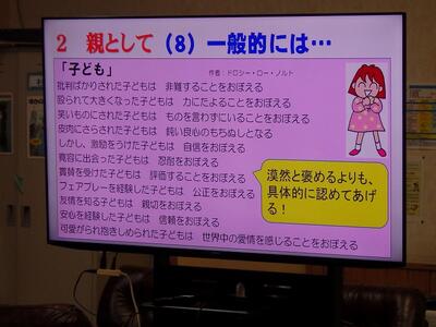 まず、門川中学校の家庭教育学級長さんによる、門川中学校の家庭教育学級の取組について発表がありました。「参加しやすい家庭教育学級」「お子さんも参加できる家庭教育学級」「保護者同士のつながりができる家庭教育学級」という3つの理念で取り組んでいらっしゃいました。私たち門川小学校でも同じ理念で家庭教育学級に取り組んでおり、発表にとても共感しました。