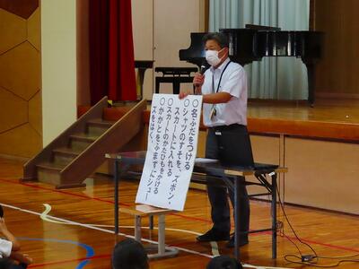 生徒指導主事は、名札、制服のすそ、スカートの肩紐、上履きシューズのかかとなど、小さな点に気を付けて落ち着いた学校生活を送ることを呼びかけました。
