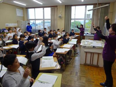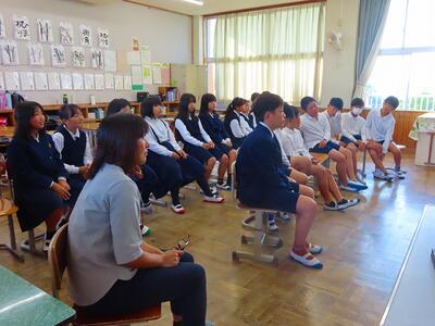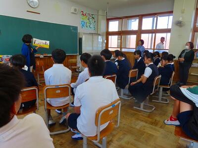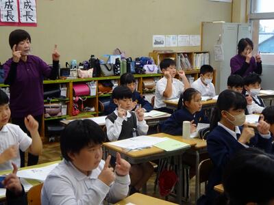 最初に、聴覚障がいや手話を使っての職業等についての説明を聞いた後、簡単なあいさつ(おはよう・こんにちは・こんばんは・さようなら・ありがとう・すみません・はじめまして・よろしくお願いします)の仕方や、指文字の表し方を教わりました。みんな、いつもの授業よりも真剣に取り組む姿が印象的でした。
