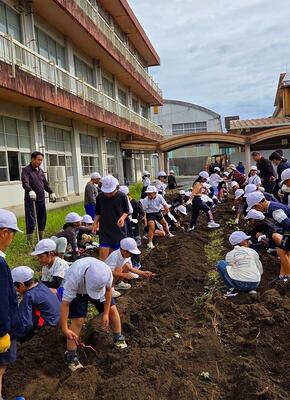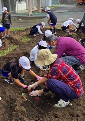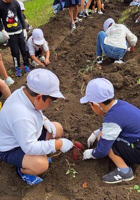 地域のボランティアの方々にサツマイモの収穫の仕方を教えてもらいながら、1本の蔓ごとに丁寧に掘っていきました。今年度は、葉の育ちが遅く、芋ができているか心配しました。しかし、地域の方と約束していた「おいもパーティー」で、一緒に美味しいお芋を食べられそうです。今から楽しみにしている児童です。(地域の方から、お芋の差し入れもいただきました。ありがとうございました。)