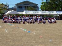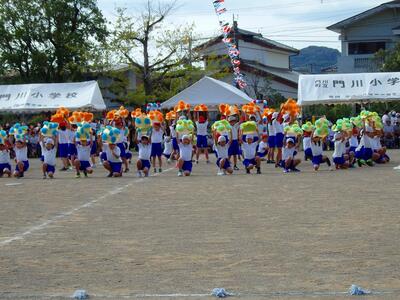 天候に恵まれ、時間帯によっては日差しの強さも感じられるほどでしたが、秋の日の一日、競技や応援などを行い、日頃経験できないことをして過ごすことができました。黄色はちまきが、門川小学校の児童でした。