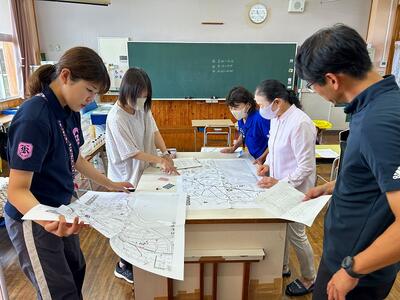 職員も地区別に分かれて、大地震が起きたときに危険な場所や通れなくなりそうな場所等を話合い、それを大きな地図に色シールを貼ってまとめていきました。そして、最善の避難経路や避難場所を設定しました。