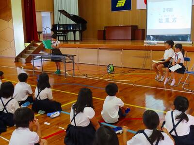 3年生の代表児童は、学習に集中することやリコーダーを練習すること、漢字を覚えることの3つの目標に向かって努力し、お手本となる3年生になりたいと発表しました。