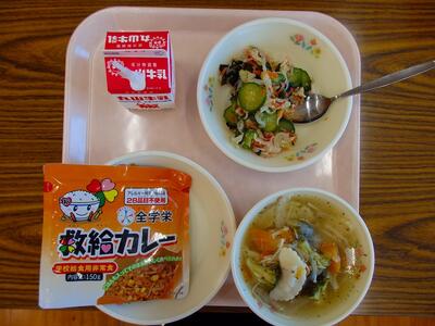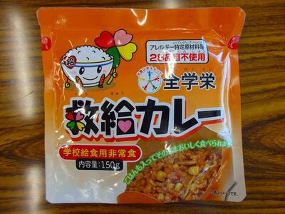本日の給食の献立は、ラビオリスープと海藻サラダ、牛乳に加え、防災の日にちなんで「救給(きゅうきゅう)カレー」でした。このカレーは、2011年の東日本大震災を経験された栄養士の先生達が、「命をつなぐ」ために災害時でもおいしく食べられるようにと作られた非常食です。ルーとご飯が一緒に入っていて、そのままでも食べられます。災害は突然起こります。日頃の備えが大切です。