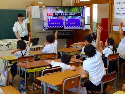 給食後は、地震がもし発生したら、どういった行動をとるべきか、10問の動画クイズに答えていきながら知識を増やしていきました。例えば次の2問です。