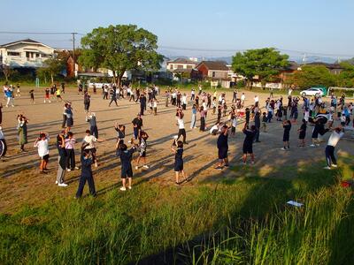 期待感を高めていました。そして、それに引き寄せられるかのようにたくさんの子どもたちや保護者の方々が集まってきました。いざ午前6時30分になると、それまでしゃべっていた子どもも真剣に体操に取り組み、ラジオ体操第二までしっかりと覚えていて体を動かしていました。