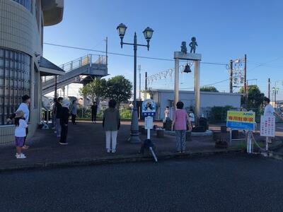 しかし、少人数でも堂々と門川駅南側の空きスペースでラジオ体操を行いました。特に「ラジオ体操第二」までしっかり覚えられていて、その体の動きにすごいなあと感心しました。さらに、場所が駅なので、通学・通勤の学生や大人の方に注目してもらえました。「東栄町の育成会はとても活発で、ラジオ体操にもしっかりと取り組んでいますよ。」と門川町のいろいろな所から集まってこられる方々にアピールすることができました。