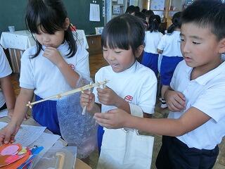 1年生は2年生の説明を聞きながら,わりばしでっぽうやボーリング,水上で咲く花など,いろいろなおもちゃやさんをまわって楽しみました。