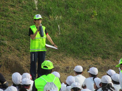 集団下校途中の15時30分に門川町の防災行政無線で大地震が発生した旨の放送が流れ、15時32分には、大津波警報が流れ、今いる自分たちの場所から一番近い避難場所へ自分たちで判断し、消防団や地域の参加の皆様の誘導や見守りのもと、高い場所を目指して一斉に避難を開始しました。子どもたちは自分たちで声を掛け合いながら、避難場所を選んで迅速に行動することができたと思います。