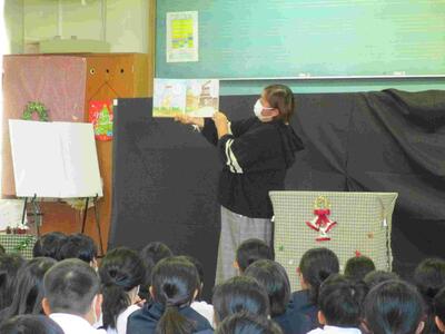 朝の会終了後から1校時の半ばまで、児童はたっぷりと絵本や紙芝居による物語の世界を楽しんだり、かみなり等の気象現象等の知識を得たりして、本の面白さを十分に味わったと思います。今回の体験やご家庭での保護者による読み聞かせの体験が、自ら本を手に取り、読んでみようかなという意欲につながると思います。