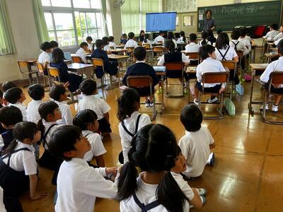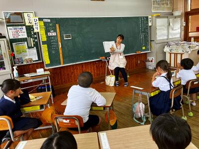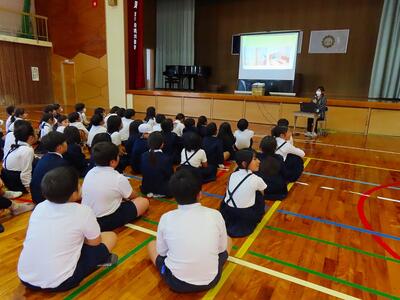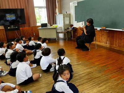 さて、お話が始まると手遊び歌が入った絵本や児童が大好きな絵本を時間いっぱい読んでくださいました。「あのね、カラーモンスターっていう本、私も大好きです。」「ねこのピートのラップの歌、楽しかった。」と、児童からたくさんの感想が聞かれました。